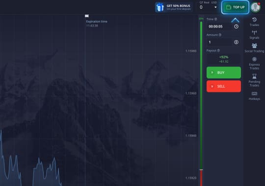 Դրանից հետո դուք կհայտնվեք ընտրված ակտիվի ներկայիս շուկայական իրավիճակում։ Բացի այդ, գրաֆիկին ավելացրեք անհրաժեշտ ցուցանիշները, միացրեք ազդանշաններն ու գծագրերը՝ շուկայի տեխնիկական վերլուծությանը նպաստելու համար։ Կատարեք ձեր կանխատեսումը և տեղադրեք պատվերը՝ օգտագործելով թրեյդինգային վահանակը։ Դուք միշտ կարող եք դիտել և վերահսկել ձեր թրեյդինգային նստաշրջանը «Թրեյդներ» ընտրացանկում։